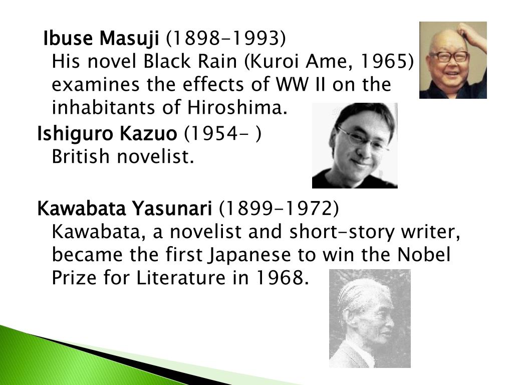 IbuseMasuji(1898-1993) His novel Black Rain (KuroiAme, 1965) examines the effects of WW II on the inhabitants of Hiroshima. Ishiguro Kazuo (1954- ) British novelist. Kawabata Yasunari(1899-1972) Kawabata, a novelist and short-story writer, became the first Japanese to win the Nobel Prize for Literature in 1968.