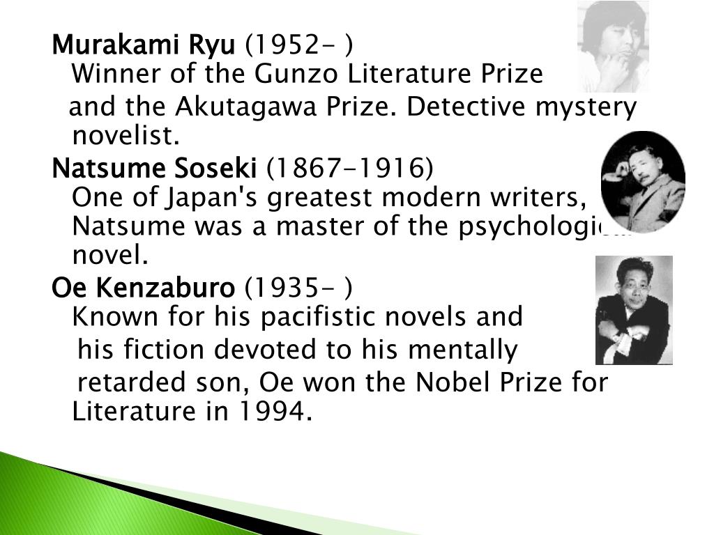 Murakami Ryu(1952- ) Winner of the Gunzo Literature Prize and the Akutagawa Prize. Detective mystery novelist. NatsumeSoseki(1867-1916) One of Japan's greatest modern writers, Natsume was a master of the psychological novel. Oe Kenzaburo (1935- ) Known for his pacifistic novels and his fiction devoted to his mentally retarded son, Oe won the Nobel Prize for Literature in 1994.