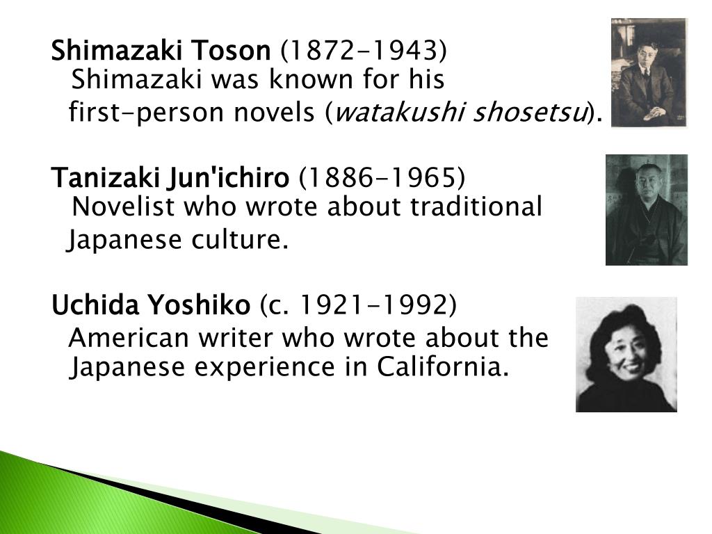 ShimazakiToson(1872-1943) Shimazaki was known for his first-person novels (watakushishosetsu). TanizakiJun'ichiro(1886-1965) Novelist who wrote about traditional Japanese culture. Uchida Yoshiko (c. 1921-1992) American writer who wrote about the Japanese experience in California.