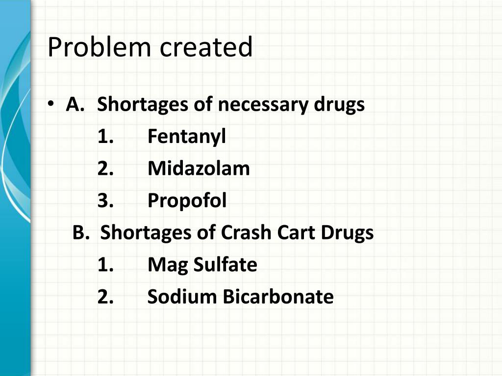 Problem created • A. Shortages of necessary drugs 1. Fentanyl 2. Midazolam 3. Propofol • Shortages of Crash Cart Drugs 1. Mag Sulfate 2. Sodium Bicarbonate
