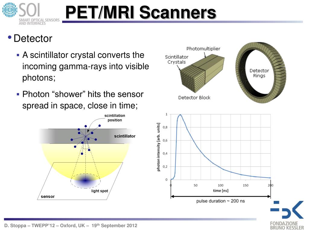 PET/MRI Scanners • Detector • A scintillator crystal converts the incoming gamma-rays into visiblephotons; • Photon “shower” hits the sensor spread in space, close in time;
