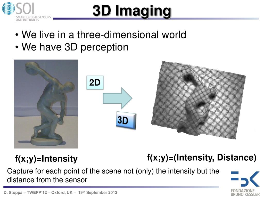 3D Imaging • We live in a three-dimensional world • We have 3D perception 2D 3D f(x;y)=(Intensity, Distance) f(x;y)=Intensity Capture for each point of the scene not (only) the intensity but the distance from the sensor