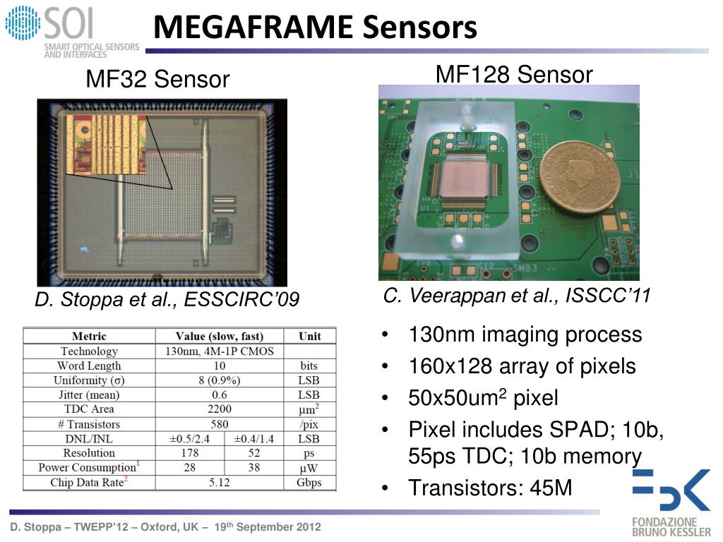 MEGAFRAME Sensors MF128 Sensor MF32 Sensor C. Veerappan et al., ISSCC’11 D. Stoppa et al., ESSCIRC’09 • 130nm imaging process • 160x128 array of pixels • 50x50um2 pixel • Pixel includes SPAD; 10b, 55ps TDC; 10b memory • Transistors: 45M