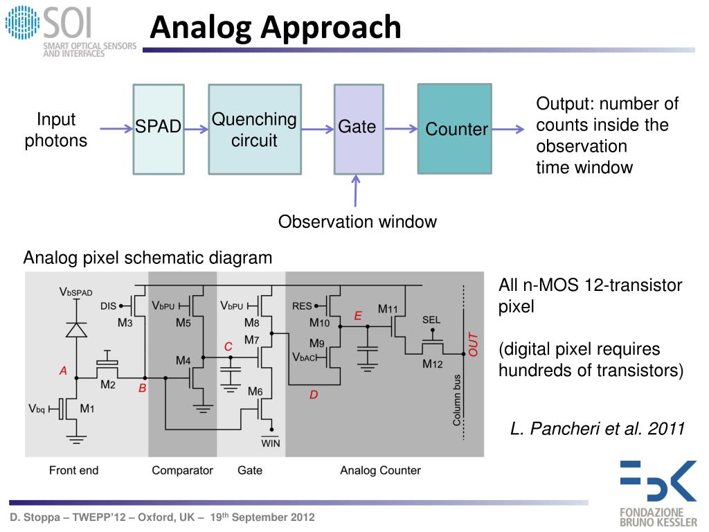 Analog Approach Output: number of counts inside the observation time window Input photons Quenching circuit SPAD Gate Counter Observation window Analog pixel schematic diagram All n-MOS 12-transistor pixel (digital pixel requires hundreds of transistors) L. Pancheri et al. 2011