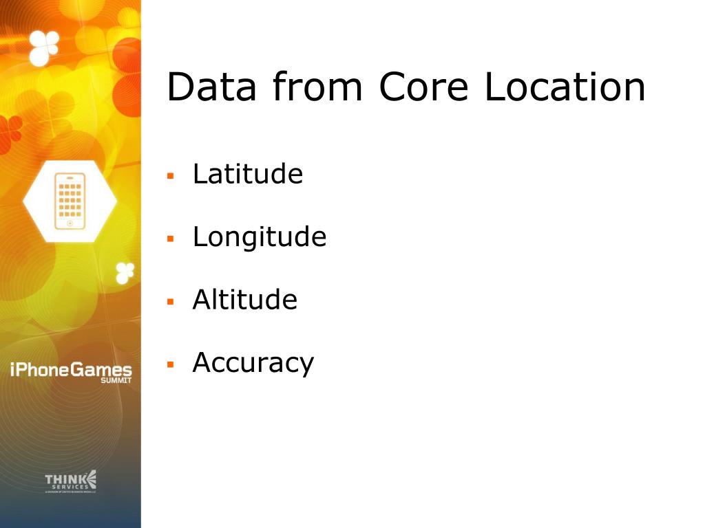 Data from Core Location • Latitude • Longitude • Altitude • Accuracy