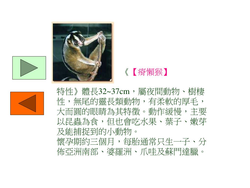 《【瘠懶猴】 特性》體長32~37cm,屬夜間動物、樹棲性,無尾的靈長類動物,有柔軟的厚毛,大而圓的眼睛為其特徵。動作緩慢,主要以昆蟲為食,但也會吃水果、葉子、嫩芽及能捕捉到的小動物。 懷孕期約三個月,每胎通常只生一子、分佈亞洲南部、婆羅洲、爪哇及蘇門達臘。