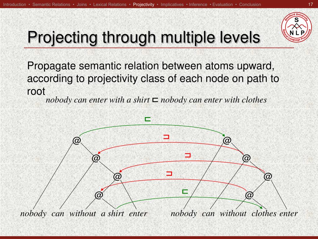 @ @ ⊐ ⊐ ⊐ @ @ ⊏ ⊏ @ @ Introduction • Semantic Relations • Joins • Lexical Relations • Projectivity • Implicatives • Inference • Evaluation • Conclusion @ @ nobody nobody can can without without clothes a shirt enter enter Projecting through multiple levels Propagate semantic relation between atoms upward, according to projectivity class of each node on path to root nobody can enter with a shirt⊏nobody can enter with clothes
