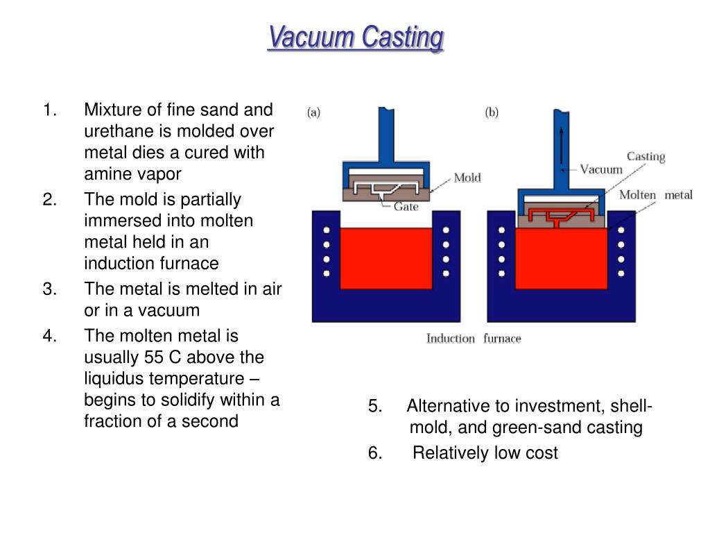 Mixture of fine sand and urethane is molded over metal dies a cured with amine vapor The mold is partially immersed into molten metal held in an induction furnace The metal is melted in air or in a vacuum The molten metal is usually 55 C above the liquidus temperature – begins to solidify within a fraction of a second 5. Alternative to investment, shell-mold, and green-sand casting 6. Relatively low cost Vacuum Casting