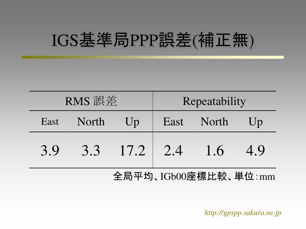 IGS基準局PPP誤差(補正無) 全局平均、IGb00座標比較、単位:mm
