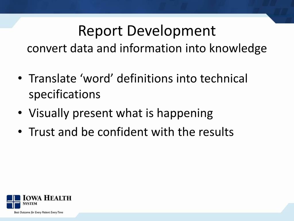 Report Developmentconvert data and information into knowledge • Translate ‘word’ definitions into technical specifications • Visually present what is happening • Trust and be confident with the results
