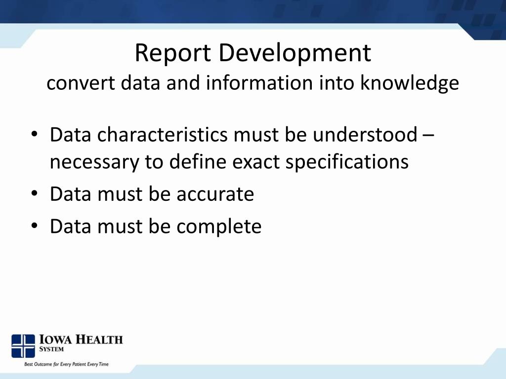 Report Developmentconvert data and information into knowledge • Data characteristics must be understood – necessary to define exact specifications • Data must be accurate • Data must be complete