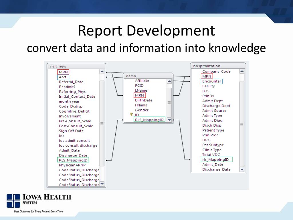 Report Developmentconvert data and information into knowledge • Data are linked across tables or files by common fields. • If data are wrong or missing, knowledge is lost.