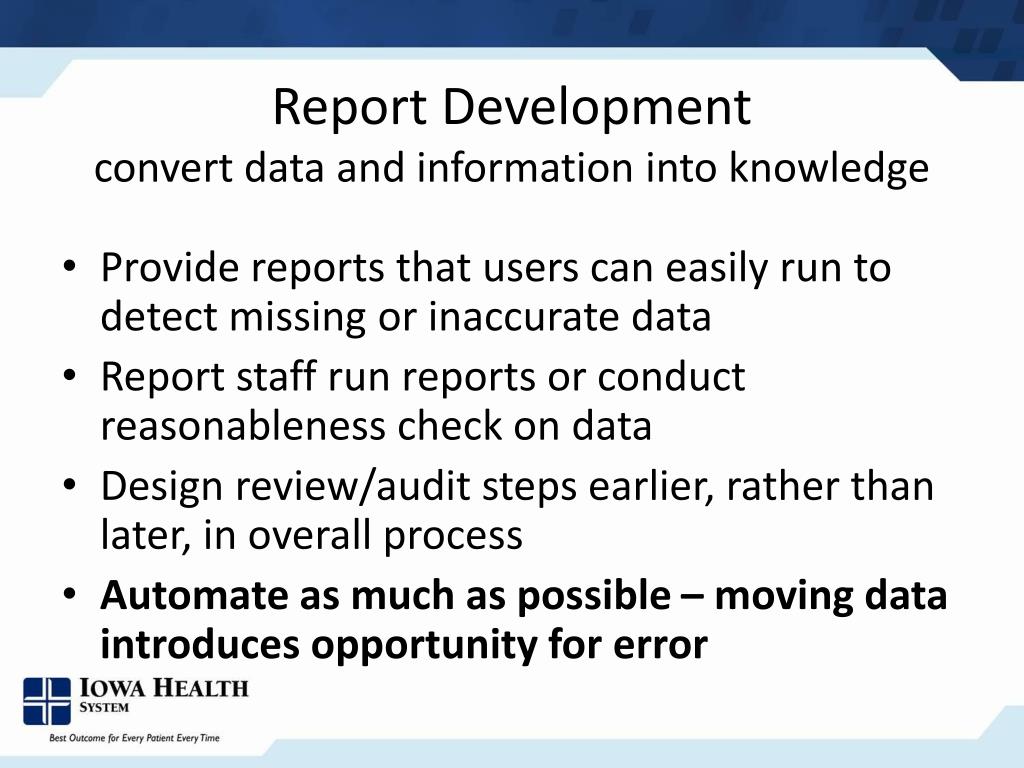 Report Developmentconvert data and information into knowledge • Provide reports that users can easily run to detect missing or inaccurate data • Report staff run reports or conduct reasonableness check on data • Design review/audit steps earlier, rather than later, in overall process • Automate as much as possible – moving data introduces opportunity for error