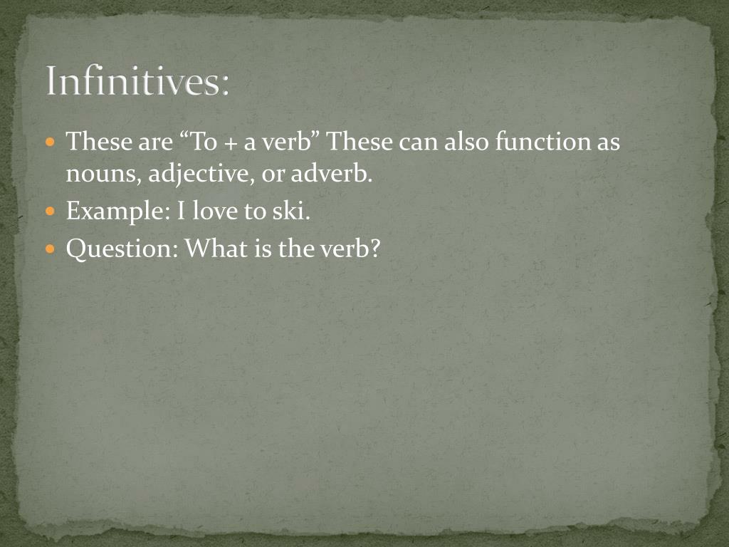 Infinitives: • These are “To + a verb” These can also function as nouns, adjective, or adverb. • Example: I love to ski. • Question: What is the verb?