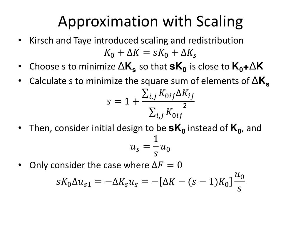 Approximation with Scaling • Kirsch and Taye introduced scaling and redistribution • Choose s to minimize ΔKsso that sK0is close to K0+ΔK • Calculate s to minimize the square sum of elements of ΔKs • Then, consider initial design to be sK0 instead of K0, and • Only consider the case where
