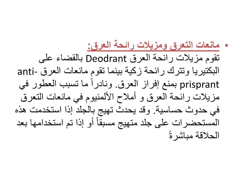 مانعات التعرق ومزيلات رائحة العرق:تقوم مزيلات رائحة العرق Deodrant بالقضاء على البكتيريا وتترك رائحة زكية بينما تقوم مانعات العرق anti-prisprant بمنع إفراز العرق. ونادراً ما تسبب العطور في مزيلات رائحة العرق و أملاح الألمنيوم في مانعات التعرق في حدوث حساسية. وقد يحدث تهيج بالجلد إذا استخدمت هذه المستحضرات على جلد متهيج مسبقاً أو إذا تم استخدامها بعد الحلاقة مباشرةً