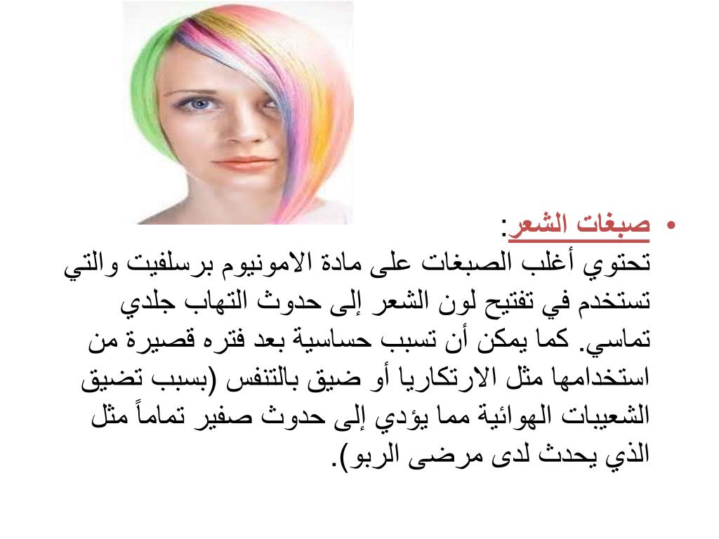 صبغاتالشعر:تحتوي أغلب الصبغات على مادة الامونيومبرسلفيت والتي تستخدم في تفتيح لون الشعر إلى حدوث التهاب جلدي تماسي. كما يمكن أن تسبب حساسية بعد فتره قصيرة من استخدامها مثل الارتكاريا أو ضيق بالتنفس (بسبب تضيق الشعيبات الهوائية مما يؤدي إلى حدوث صفير تماماً مثل الذي يحدث لدى مرضى الربو).