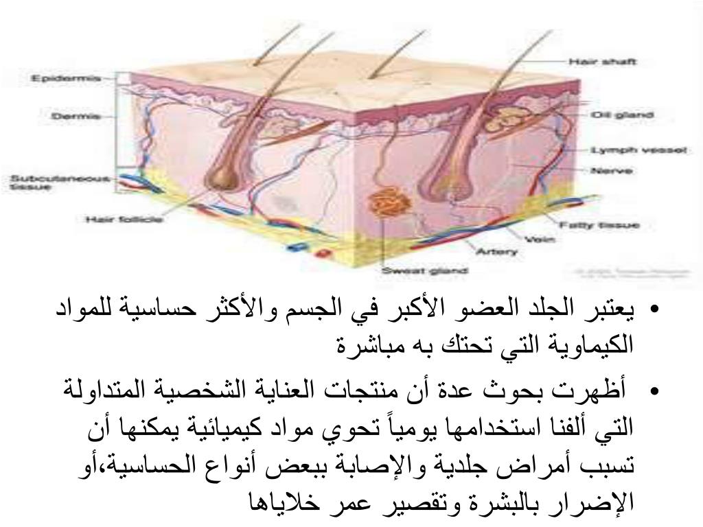 يعتبر الجلد العضو الأكبر في الجسم والأكثر حساسية للمواد الكيماوية التي تحتك به مباشرة • أظهرت بحوث عدة أن منتجات العناية الشخصية المتداولة التي ألفنا استخدامها يومياً تحوي مواد كيميائية يمكنها أن تسبب أمراض جلدية والإصابة ببعض أنواع الحساسية،أو الإضرار بالبشرة وتقصير عمر خلاياها