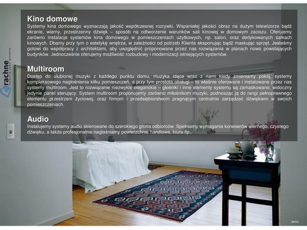 Kino domowe Systemy kina domowego wyznaczają jakość współczesnej rozrywki. Wspaniałej jakości obraz na dużym telewizorze bądź ekranie, wierny, przestrzenny dźwięk – sposób na odtworzenie warunków sali kinowej w domowym zaciszu. Oferujemy zarówno instalacje systemów kina domowego w pomieszczeniach użytkowych, np. salon, oraz dedykowanych salkach kinowych. Dbamy przy tym o estetykę wnętrza, w zależności od potrzeb Klienta eksponując bądź maskując sprzęt. Jesteśmy gotowi do współpracy z architektami, aby uwzględnić proponowane przez nas rozwiązania w planach nowo powstających budynków. Jednocześnie oferujemy możliwość rozbudowy i modernizacji istniejących systemów. Multiroom Dostęp do ulubionej muzyki z każdego punktu domu, muzyka idąca wraz z nami kiedy zmieniamy pokój, systemy kompleksowego nagłośnienia kilku pomieszczeń, a przy tym prostota obsługi – to właśnie oferowane i instalowane przez nas systemy multiroom. Jest to rozwiązanie niezwykle eleganckie – głośniki i inne elementy systemu są zamaskowane, widoczny jedynie panel sterujący. System multiroom proponujemy zarówno miłośnikom muzyki, podnosząc ją do rangi pełnoprawnego elementu przestrzeni życiowej, oraz firmom i przedsiębiorstwom pragnącym centralnie zarządzać dźwiękiem w swoich pomieszczeniach. Audio Instalujemy systemy audio skierowane do szerokiego grona odbiorców. Spełniamy wymagania koneserów wiernego, czystego dźwięku, a także profesjonalnie nagłaśniamy powierzchnie handlowe, biura itp.. Jamo