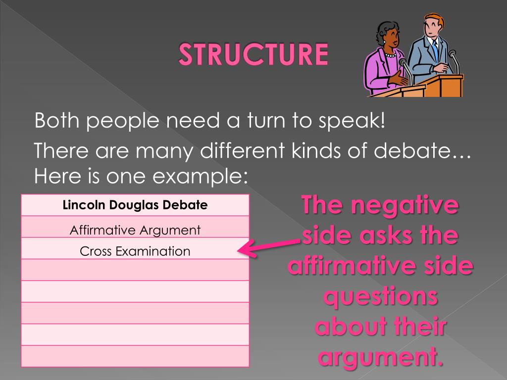 STRUCTURE Both people need a turn to speak! There are many different kinds of debate… Here is one example: The negative side asks the affirmative side questions about their argument. Affirmative Argument Cross Examination