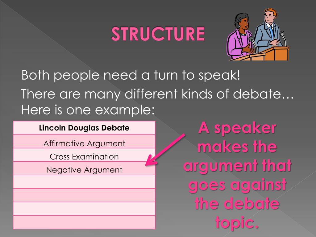 STRUCTURE Both people need a turn to speak! There are many different kinds of debate… Here is one example: A speaker makes the argument that supports the debate topic. Affirmative Argument