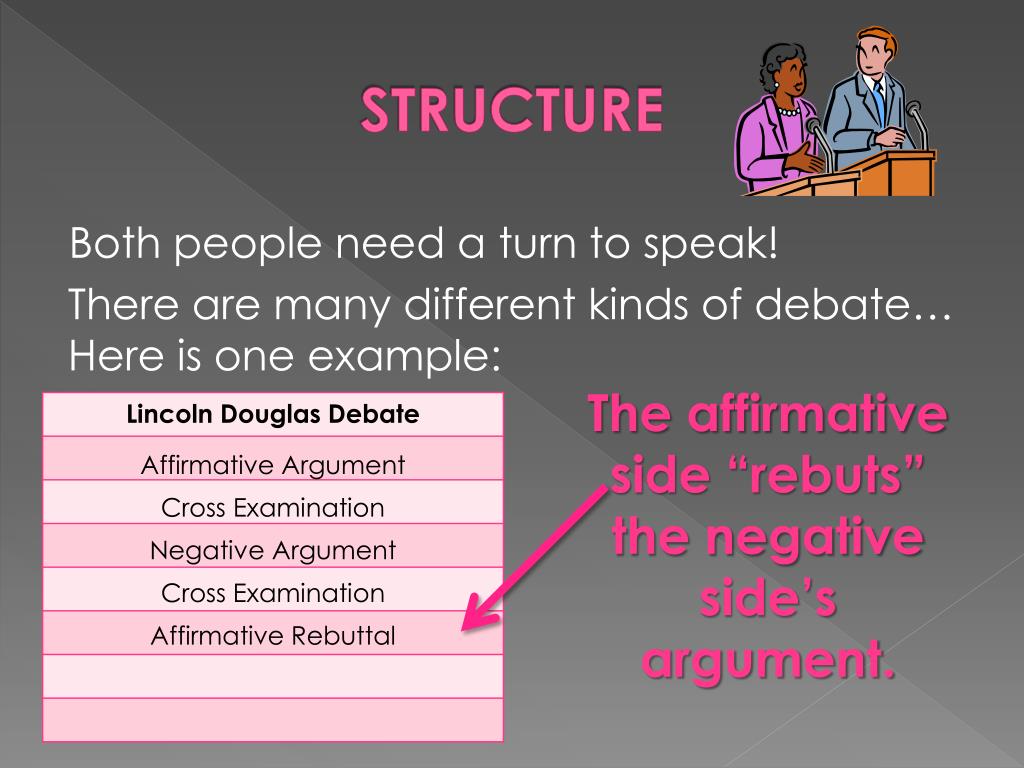STRUCTURE Both people need a turn to speak! There are many different kinds of debate… Here is one example: The negative side rebuts the affirmative argument. Affirmative Argument Cross Examination Negative Argument Cross Examination Affirmative Rebuttal Negative Rebuttal