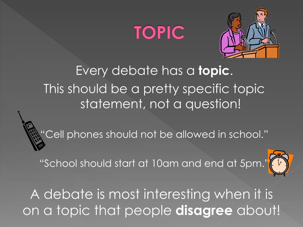TOPIC Every debate has a topic. This should be a pretty specific topic statement, not a question! “Cell phones should not be allowed in school.” “School should start at 10am and end at 5pm.” A debate is most interesting when it is on a topic that people disagree about!