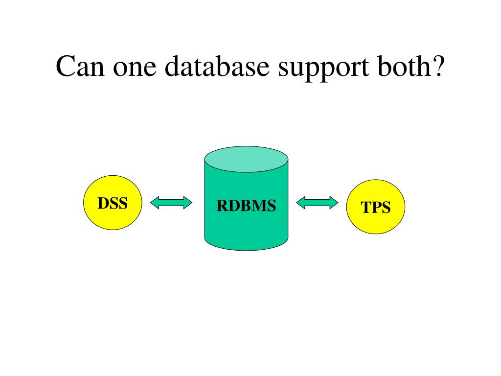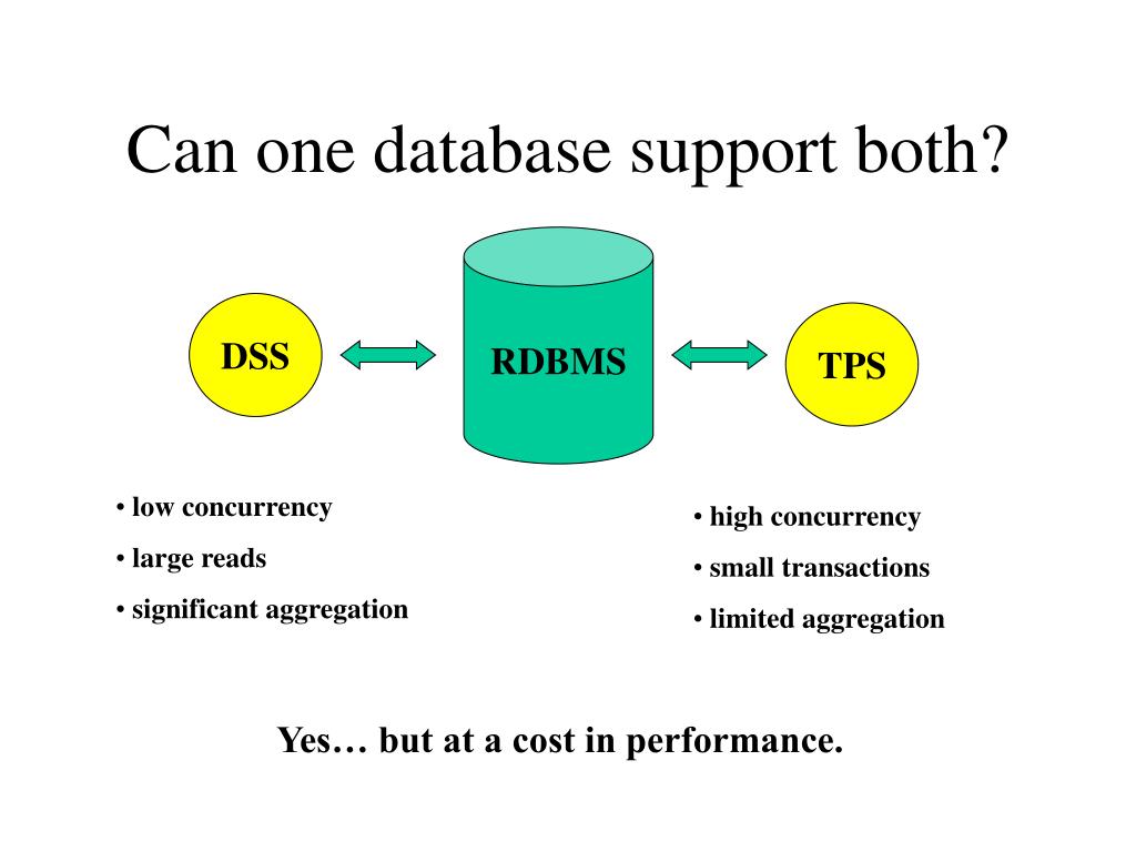 Can one database support both? RDBMS DSS TPS • low concurrency • large reads • significant aggregation • high concurrency • small transactions • limited aggregation Yes… but at a cost in performance.
