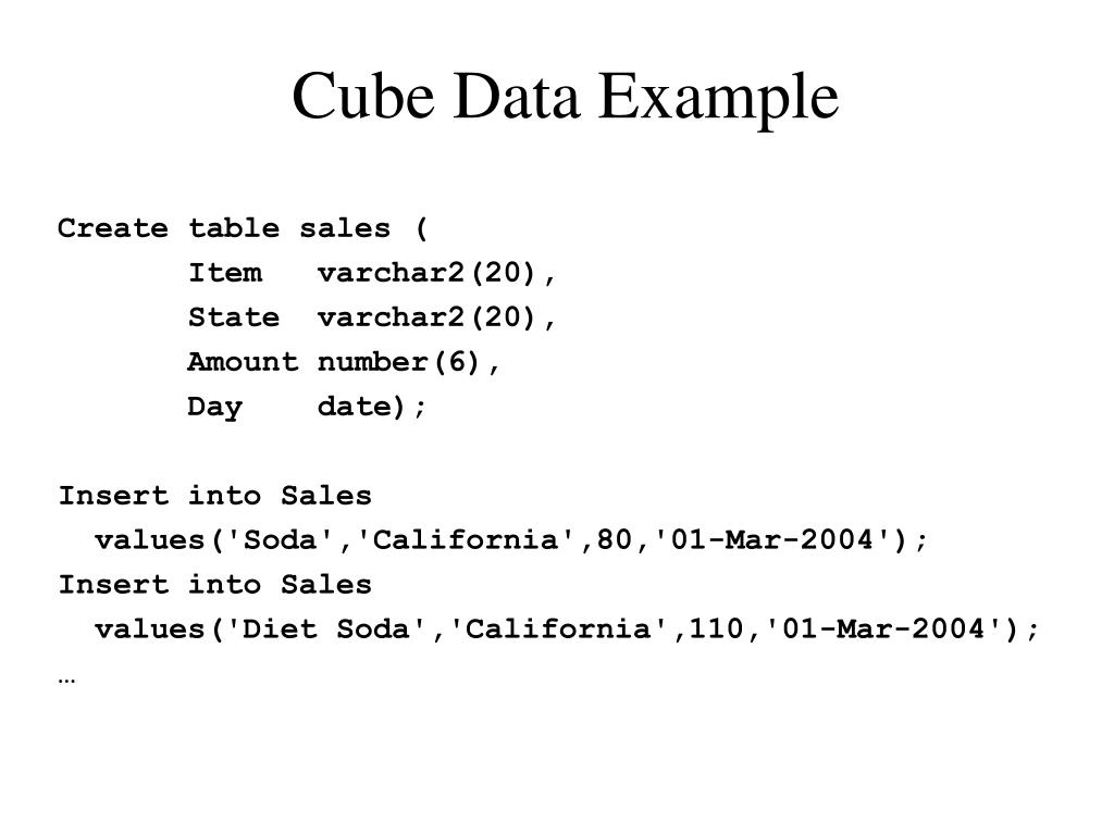 Cube Data Example Create table sales ( Item varchar2(20), State varchar2(20), Amount number(6), Day date); Insert into Sales values('Soda','California',80,'01-Mar-2004'); Insert into Sales values('Diet Soda','California',110,'01-Mar-2004'); …