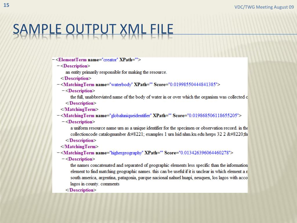 Following is a list of resulting terms obtained from Lucene Vocabulary Term Mapper which matches with the existing mapping between DublinCore and EML • Title – Title • Creator – Creator • Publisher – Publisher • Format – Physical • Coverage- Coverage • Rights – Intellectual Rights VDC/TWG Meeting August 09 Dublin core elements in eml