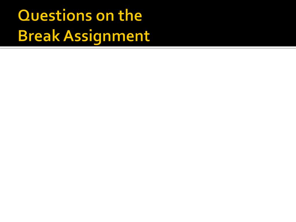 Take out your break assignment and look through for any questions you might have had. Welcome Back!