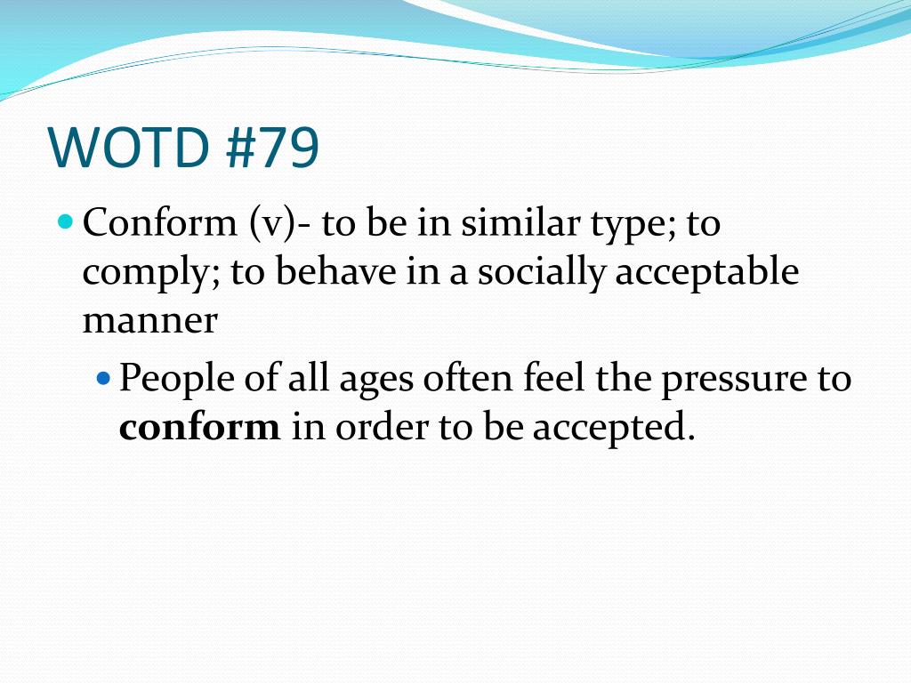 WOTD #79 • Conform (v)- to be in similar type; to comply; to behave in a socially acceptable manner • People of all ages often feel the pressure to conform in order to be accepted.