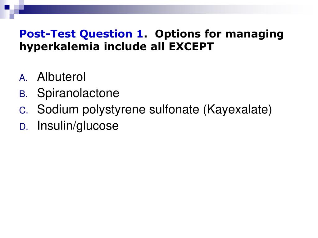 Post-Test Question 1. Options for managing hyperkalemia include all EXCEPT • Albuterol • Spiranolactone • Sodium polystyrene sulfonate (Kayexalate) • Insulin/glucose