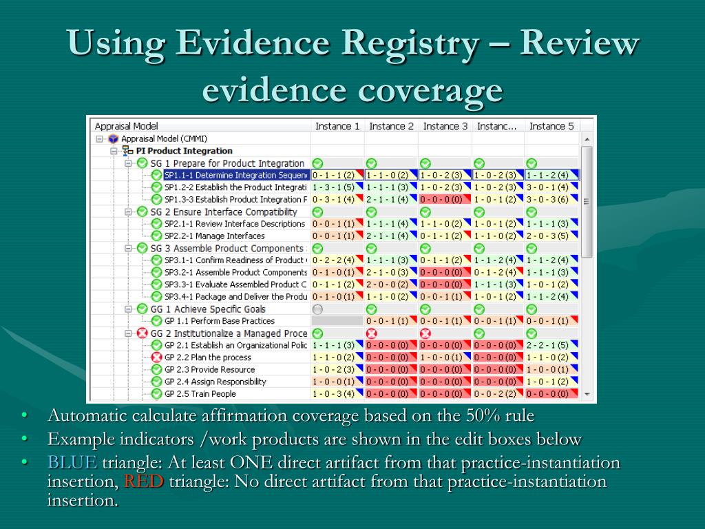 Using Evidence Registry – Review evidence coverage • Automatic calculate affirmation coverage based on the 50% rule • Example indicators /work products are shown in the edit boxes below • BLUE triangle: At least ONE direct artifact from that practice-instantiation insertion, RED triangle: No direct artifact from that practice-instantiation insertion.