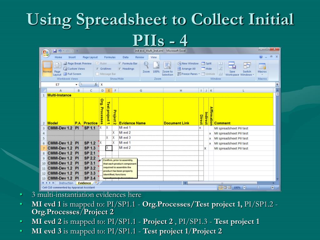 Using Spreadsheet to Collect Initial PIIs - 2 • 3 evidences here, associated to 3 practices • Single instantiation spreadsheet, instantiation name in the top most cell • Detail description of process areas and practices in cell comments