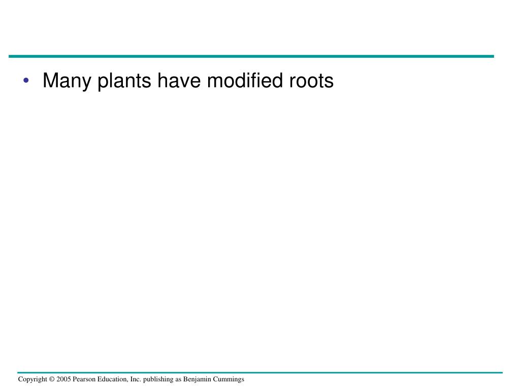 Roots • Functions of roots: • Anchoring the plant • Absorbing minerals and water • Often storing organic nutrients