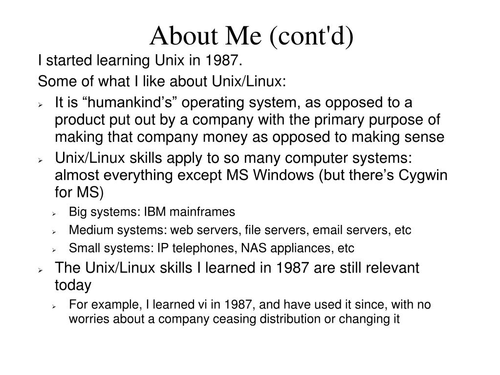 About Me (cont'd) • I started learning Unix in 1987. • Some of what I like about Unix/Linux: • It is “humankind’s” operating system, as opposed to a product put out by a company with the primary purpose of making that company money as opposed to making sense • Unix/Linux skills apply to so many computer systems: almost everything except MS Windows (but there’s Cygwin for MS) • Big systems: IBM mainframes • Medium systems: web servers, file servers, email servers, etc • Small systems: IP telephones, NAS appliances, etc • The Unix/Linux skills I learned in 1987 are still relevant today • For example, I learned vi in 1987, and have used it since, with no worries about a company ceasing distribution or changing it