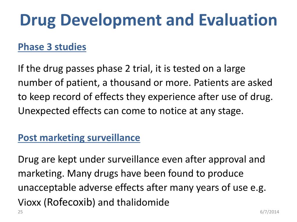 Drug Development and Evaluation Phase 3 studies If the drug passes phase 2 trial, it is tested on a large number of patient, a thousand or more. Patients are asked to keep record of effects they experience after use of drug. Unexpected effects can come to notice at any stage. Post marketing surveillance Drug are kept under surveillance even after approval and marketing. Many drugs have been found to produce unacceptable adverse effects after many years of use e.g. Vioxx (Rofecoxib) and thalidomide