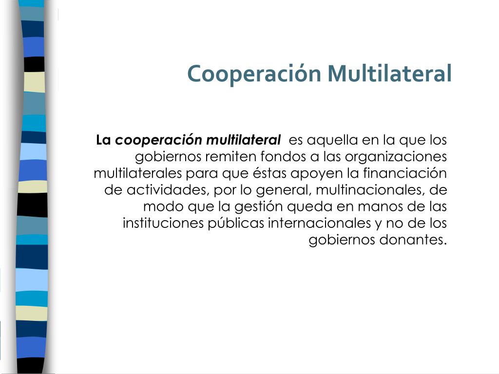 Cooperación Multilateral La cooperación multilaterales aquella en la que los gobiernos remiten fondos a las organizaciones multilaterales para que éstas apoyen la financiación de actividades, por lo general, multinacionales, de modo que la gestión queda en manos de las instituciones públicas internacionales y no de los gobiernos donantes.
