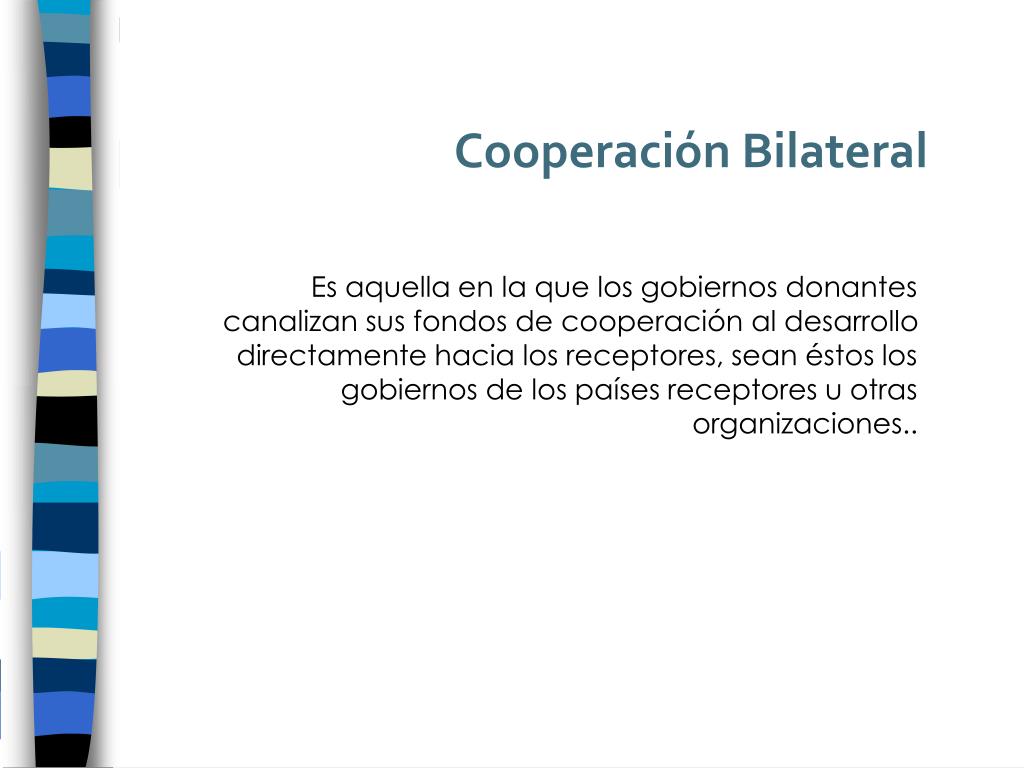 Cooperación Bilateral Es aquella en la que los gobiernos donantes canalizan sus fondos de cooperación al desarrollo directamente hacia los receptores, sean éstos los gobiernos de los países receptores u otras organizaciones..