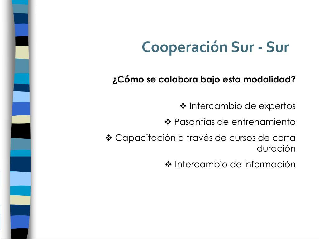 Cooperación Sur - Sur ¿Cómo se colabora bajo esta modalidad? • Intercambio de expertos • Pasantías de entrenamiento • Capacitación a través de cursos de corta duración • Intercambio de información