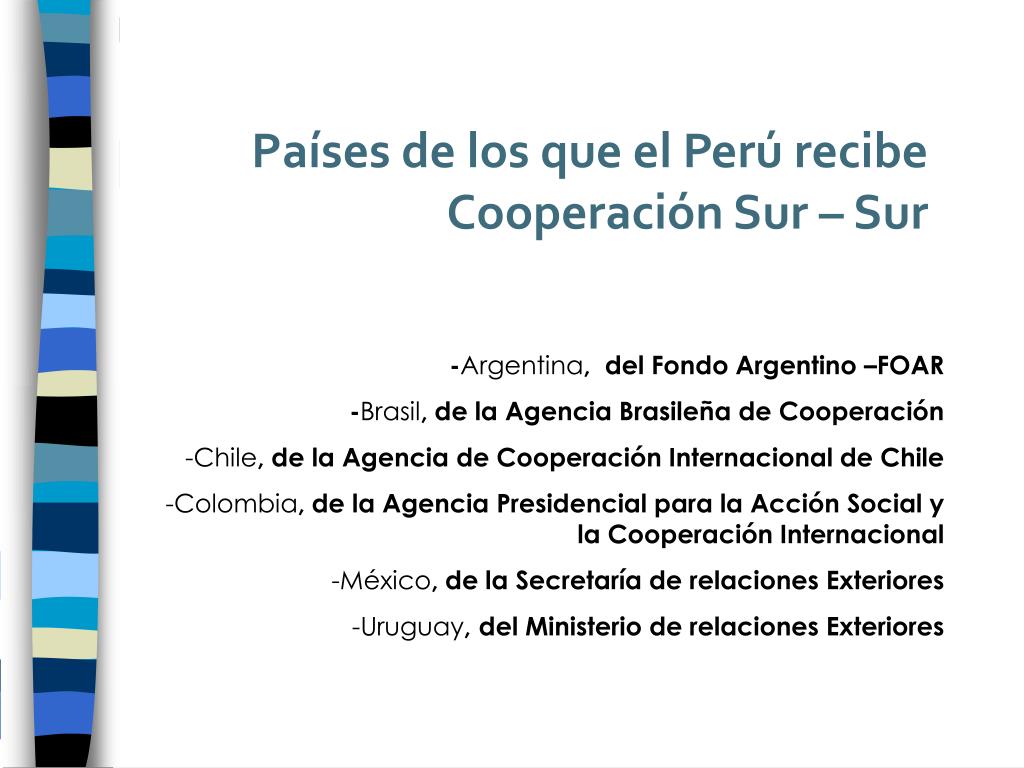 Países de los que el Perú recibe Cooperación Sur – Sur -Argentina, del Fondo Argentino –FOAR -Brasil, de la Agencia Brasileña de Cooperación • Chile, de la Agencia de Cooperación Internacional de Chile • Colombia, de la Agencia Presidencial para la Acción Social y la Cooperación Internacional • México, de la Secretaría de relaciones Exteriores • Uruguay, del Ministerio de relaciones Exteriores