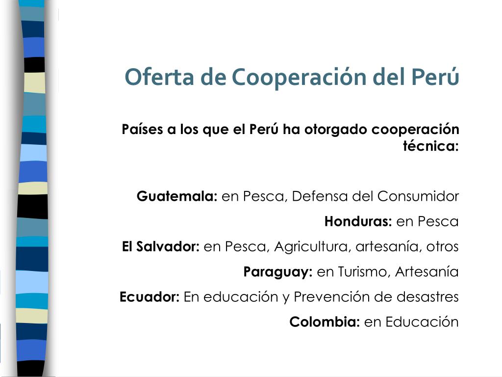 Oferta de Cooperación del Perú Países a los que el Perú ha otorgado cooperación técnica: Guatemala: en Pesca, Defensa del Consumidor Honduras: en Pesca El Salvador: en Pesca, Agricultura, artesanía, otros Paraguay: en Turismo, Artesanía Ecuador: En educación y Prevención de desastres Colombia: en Educación