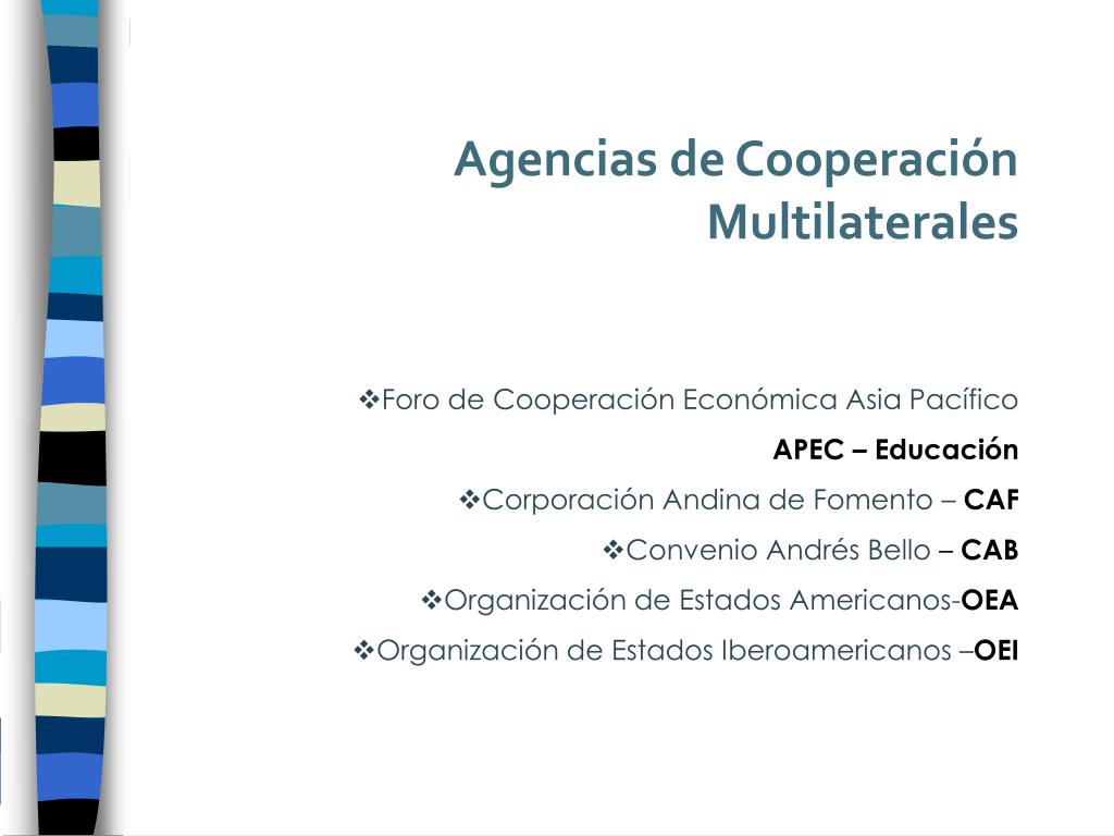 Agencias de Cooperación Multilaterales • Foro de Cooperación Económica Asia Pacífico • APEC – Educación • Corporación Andina de Fomento – CAF • Convenio Andrés Bello – CAB • Organización de Estados Americanos-OEA • Organización de Estados Iberoamericanos –OEI