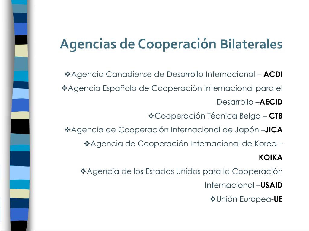Agencias de Cooperación Bilaterales • Agencia Canadiense de Desarrollo Internacional – ACDI • Agencia Española de Cooperación Internacional para el Desarrollo –AECID • Cooperación Técnica Belga – CTB • Agencia de Cooperación Internacional de Japón –JICA • Agencia de Cooperación Internacional de Korea – KOIKA • Agencia de los Estados Unidos para la Cooperación Internacional –USAID • Unión Europea-UE