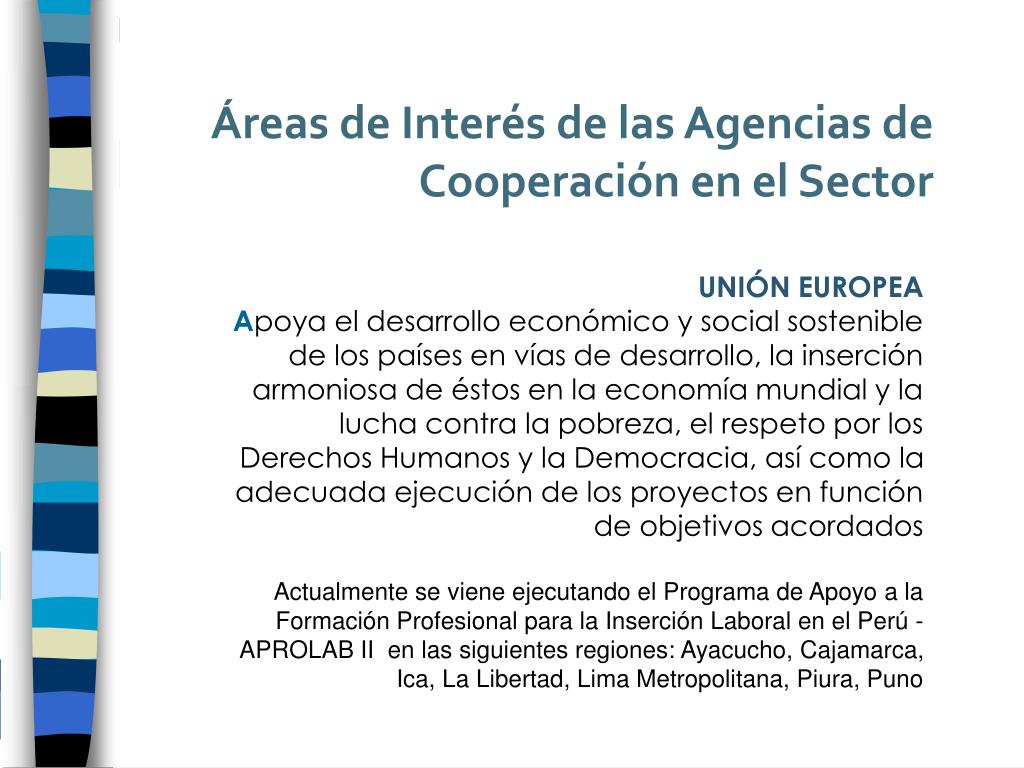Áreas de Interés de las Agencias de Cooperación en el Sector UNIÓN EUROPEAApoya el desarrollo económico y social sostenible de los países en vías de desarrollo, la inserción armoniosa de éstos en la economía mundial y la lucha contra la pobreza, el respeto por los Derechos Humanos y la Democracia, así como la adecuada ejecución de los proyectos en función de objetivos acordados Actualmente se viene ejecutando el Programa de Apoyo a la Formación Profesional para la Inserción Laboral en el Perú -APROLAB II en las siguientes regiones: Ayacucho, Cajamarca, Ica, La Libertad, Lima Metropolitana, Piura, Puno