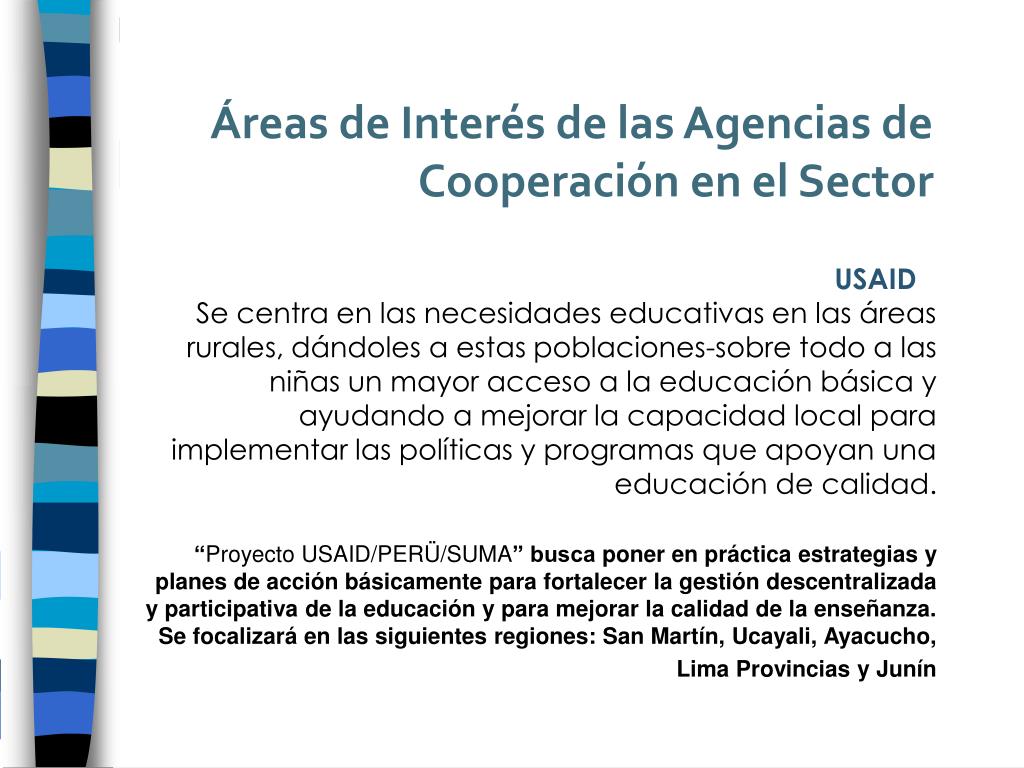 Áreas de Interés de las Agencias de Cooperación en el Sector USAIDSe centra en las necesidades educativas en las áreas rurales, dándoles a estas poblaciones-sobre todo a las niñas un mayor acceso a la educación básica y ayudando a mejorar la capacidad local para implementar las políticas y programas que apoyan una educación de calidad. “Proyecto USAID/PERÜ/SUMA” busca poner en práctica estrategias y planes de acción básicamente para fortalecer la gestión descentralizada y participativa de la educación y para mejorar la calidad de la enseñanza. Se focalizará en las siguientes regiones: San Martín, Ucayali, Ayacucho, Lima Provincias y Junín