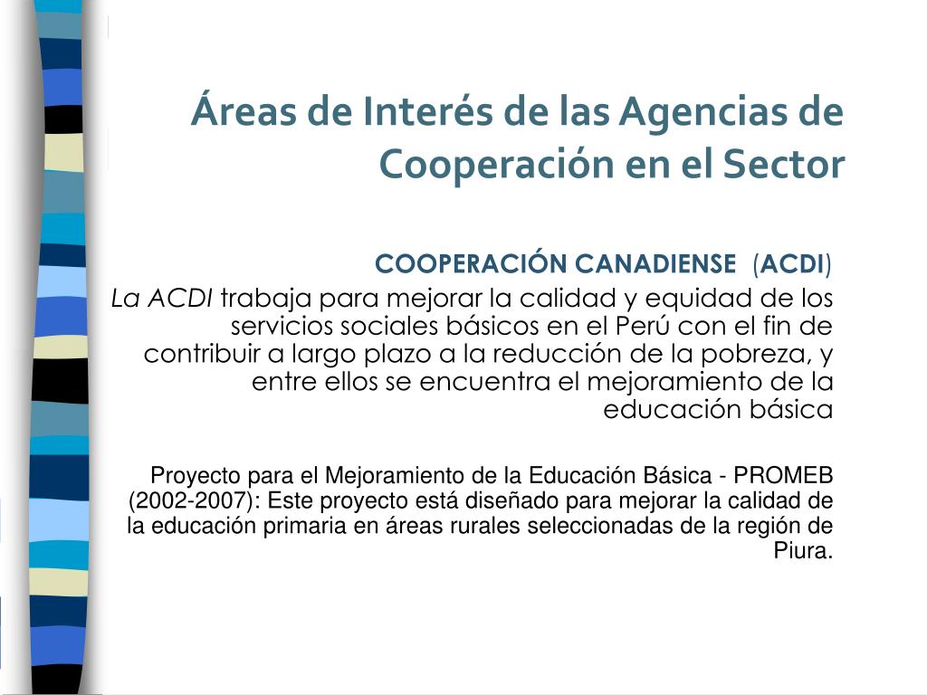 Áreas de Interés de las Agencias de Cooperación en el Sector COOPERACIÓN CANADIENSE(ACDI) La ACDI trabaja para mejorar la calidad y equidad de los servicios sociales básicos en el Perú con el fin de contribuir a largo plazo a la reducción de la pobreza, y entre ellos se encuentra el mejoramiento de la educación básica Proyecto para el Mejoramiento de la Educación Básica - PROMEB (2002-2007): Este proyecto está diseñado para mejorar la calidad de la educación primaria en áreas rurales seleccionadas de la región de Piura.