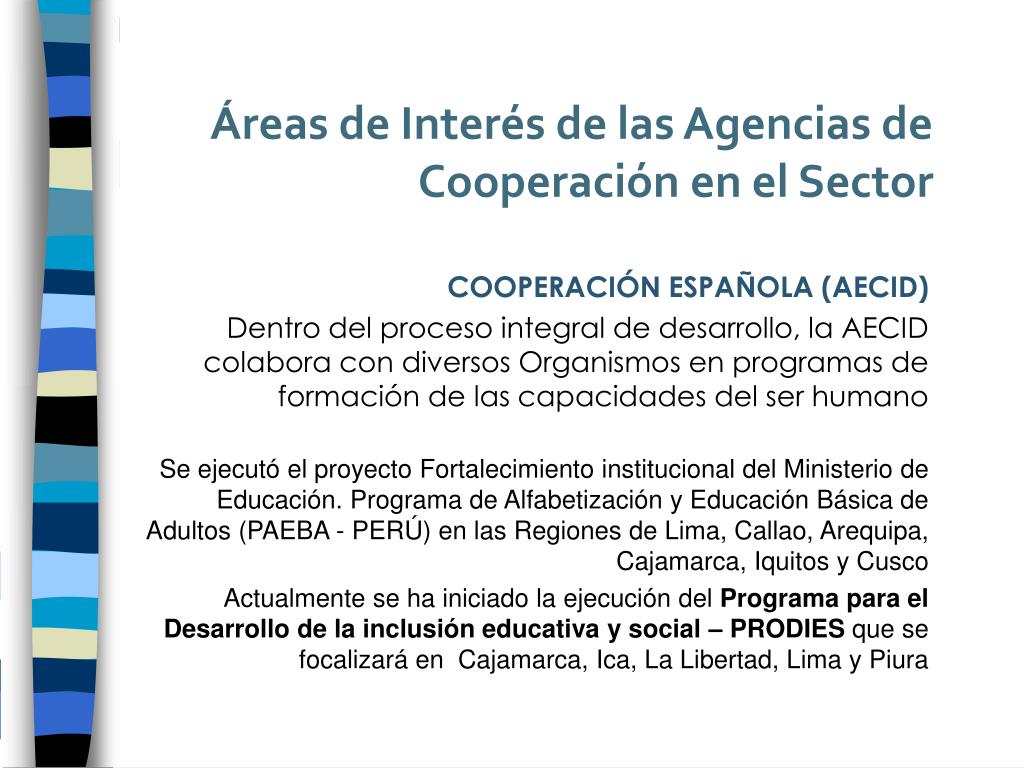 Áreas de Interés de las Agencias de Cooperación en el Sector COOPERACIÓN ESPAÑOLA (AECID) Dentro del proceso integral de desarrollo, la AECID colabora con diversos Organismos en programas de formación de las capacidades del ser humano Se ejecutó el proyecto Fortalecimiento institucional del Ministerio de Educación. Programa de Alfabetización y Educación Básica de Adultos (PAEBA - PERÚ) en las Regiones de Lima, Callao, Arequipa, Cajamarca, Iquitos y Cusco Actualmente se ha iniciado la ejecución del Programa para el Desarrollo de la inclusión educativa y social – PRODIES que se focalizará en Cajamarca, Ica, La Libertad, Lima y Piura