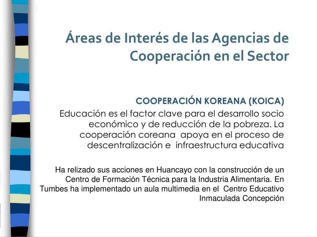 Áreas de Interés de las Agencias de Cooperación en el Sector COOPERACIÓN KOREANA (KOICA) Educación es el factor clave para el desarrollo socio económico y de reducción de la pobreza. La cooperación coreana apoya en el proceso de descentralización e infraestructura educativa Ha relizado sus acciones en Huancayo con la construcción de un Centro de Formación Técnica para la Industria Alimentaria. En Tumbes ha implementado un aula multimedia en el Centro Educativo Inmaculada Concepción